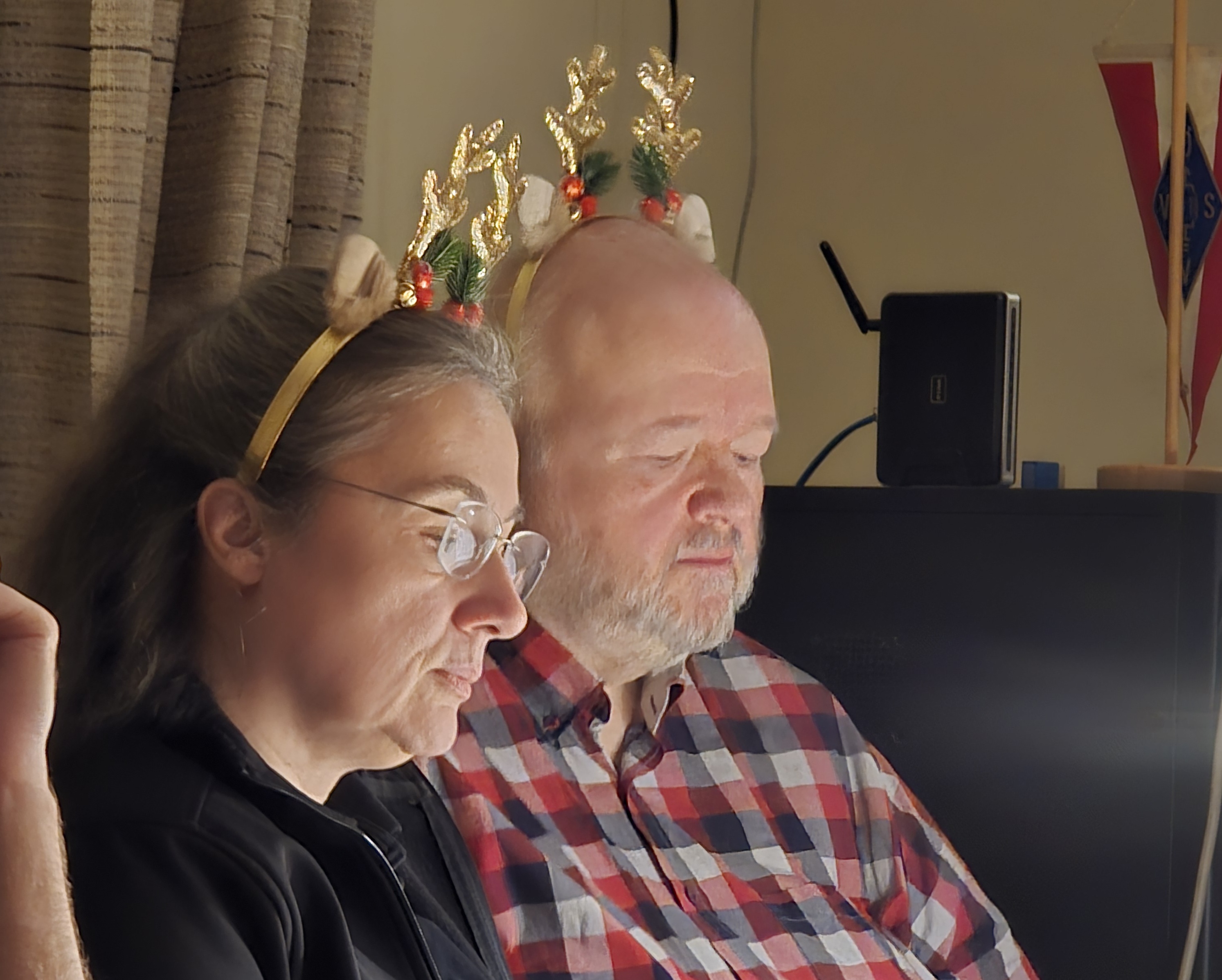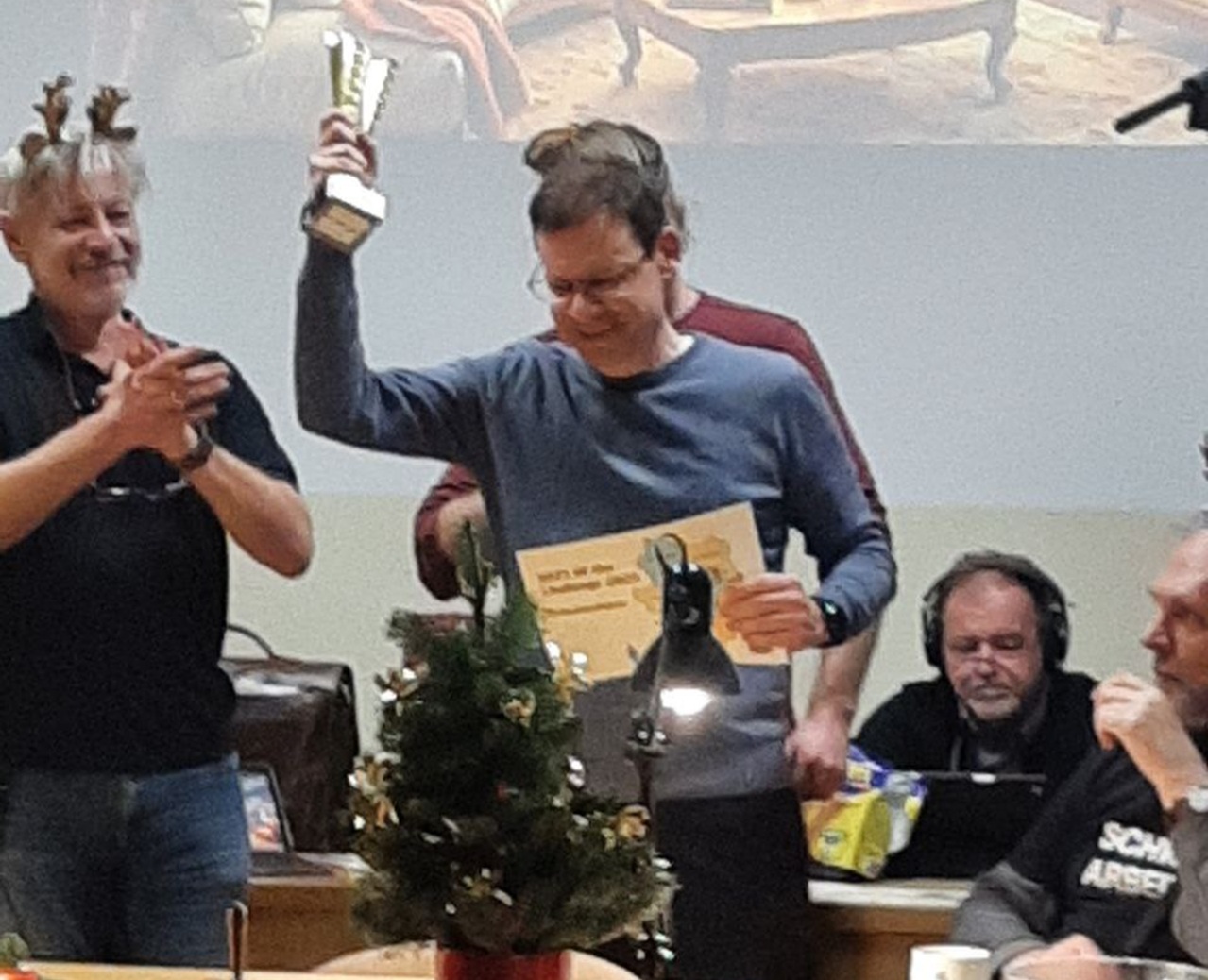 Den Abend dominierte die Weihnachtsgeschichte geschrieben von Arnold OE1IAH. Der Weihnachtsmann wird von Dieben gefangen genommen um die Geschenke zu erpressen. Rudi das funkaffine Rentier bittet abermals die Funktiere aus Wien um Hilfe. Die Geschichte wurde von einigen HAMs vor Ort mit verteilten Rollen gelesen. Die Sprecher waren mit Rentiergeweihen verziert. Es gelang die Geschichte stimmungsvoll zu präsentieren. Für den Radio DARC gibt es eine weiteree Variante die Wolfgang OE1WBS im Studio eingelesen hat. Beide Varianten un der Text selbst sind über das WEB von OE1IAH abrufbar. Die Version vom LV1 Treffen wird als Weihnachtsspecial Ende Dezember als Wienrundspruch ausgesendet werden. Traditionell gibt es abermals ein Rätselspiel und das Versenden einer Erinnungskarte.