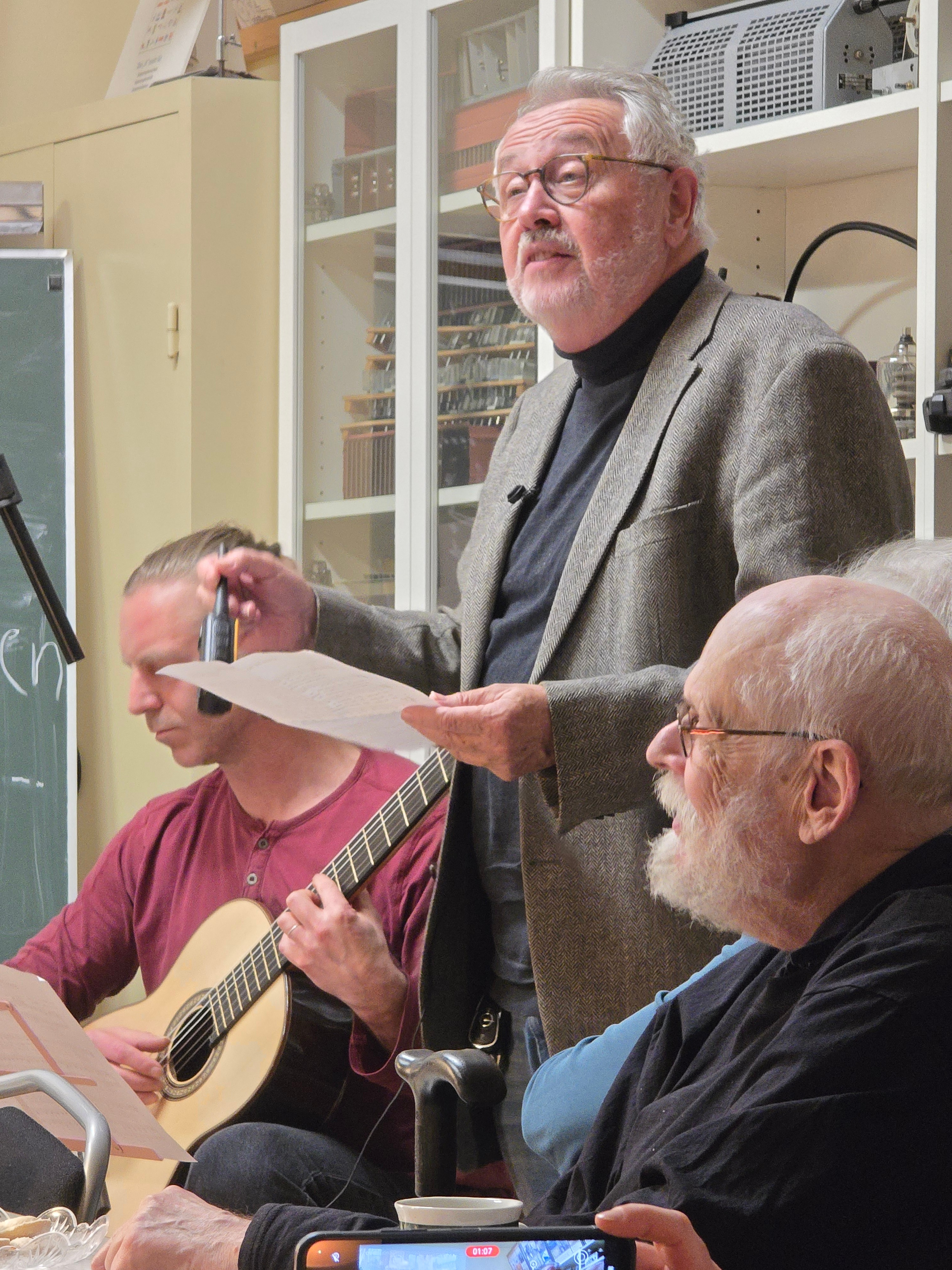 Einen weiteren Beitrag steuerte Willi OE1WKL bei. Unterstützt und begleitet von OE3VBU trug OE1WKL ein Funkerlied vor. Es hatte die besonderen Umstände rund um die Nutzung der weit verbreiteten simplen Funkgeräte aus Fernost zum Thema.