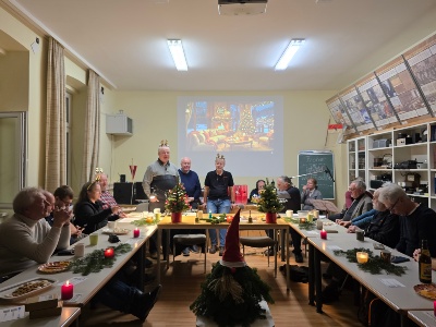 Das traditionelle Treffen im Lehrsaal des LV1 ist inzwischen ein Fixpunkt für viele HAMs in Wien. Der Raum war festlich geschmückt, hier waren Kurt OE1KBC und seine Frau Gabi bereits die Tage davor fleißig am Herrichten. Der Vorstand hat süßes und salziges Fingerfood vorbereitet, in der Küche werkelte Andreas OE3BAJ um Glühwein und nichtalkohlischen Glühmost zu wärmen. Martin OE3VBU begleitete den Abend an der Gitarre.
